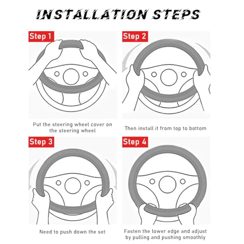 【Easy to Install】: The installation is very easy. First, fix the product on the top of the steering wheel. Then, stretch it down and to the sides until it covers the whole steering wheel. Finally, adjust it until it fits perfectly snugly on the steering wheel.