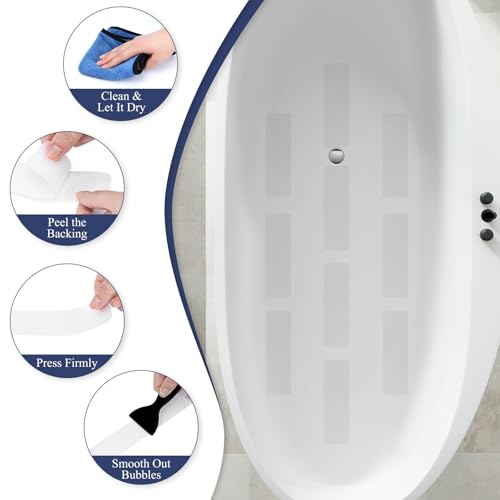 Easy to Install & Remove: Clean and dry the smooth surface. Peel the non-slip shower stickers, stick flat, scrape air bubbles, let sit 12h for better adhesion. Remove per guidelines—no residue or damage to bathtubs or other surface