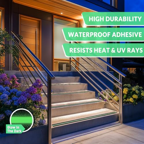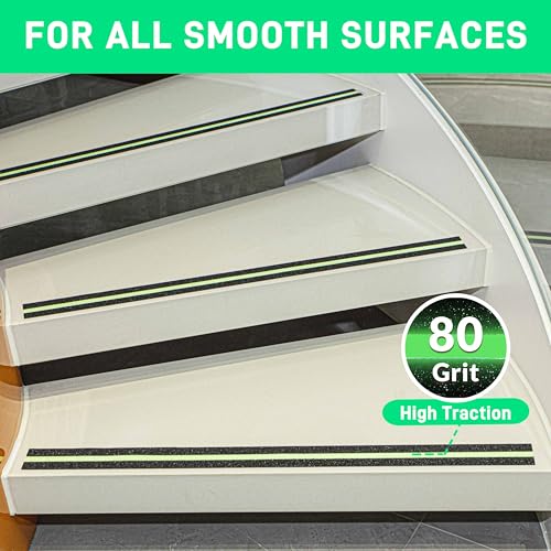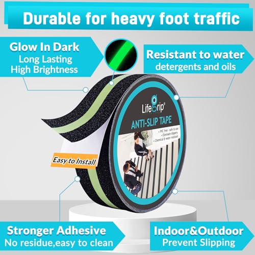 LifeGrip Anti Slip Traction Tape with Glow in Dark Green Stripe, 2 Inch x 15 Feet – Best Grip Tape, Friction, Abrasive Adhesive for Stairs, Tread Step, Indoor and Outdoor, Black (2″ X 15′)