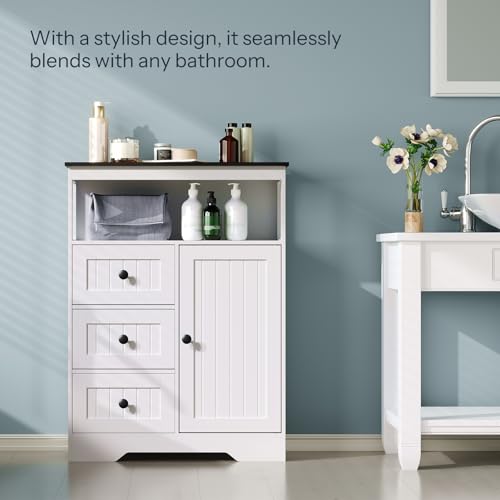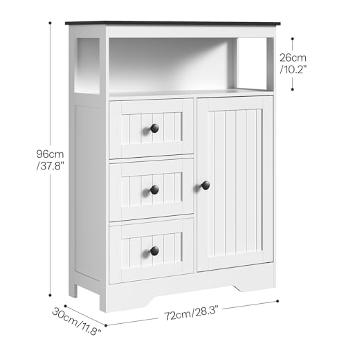 HOOBRO 28.3″ Bathroom Storage Cabinet, Large Floor Cabinet, Freestanding Bathroom Storage Unit, 1 Cupboard and 3 Drawers, Adjustable Shelf, 28.3″ L x 11.8″ W x 37.8″ H, White and Black