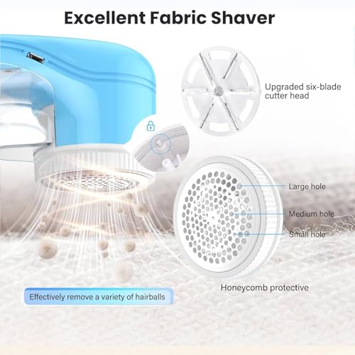 Efficient Fabric Shaver: The handheld fabric shaver uses large-size 6-leaf blades, compared to the traditional 3-leaf blades, we equip with 3pcs rust-proof 6-leaf blades, which can greatly improve the working efficiency. Built-in suction system and powerful motor, 3 shaving hole sizes, efficiency is increased by 100%, saving 50% of the time.
