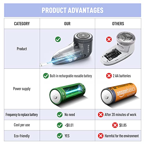 RECHARGEABLE, EASY TO USE,TRAVEL-FRIENDLY – This fabric shaver designed with USB charging, which makes charging easily, direct plug to laptop/desktop, power-bank, car charger, charger adapter(5V/1A).No need to waste your money on the batteries anymore. One time full charged will run about 30-40 minutes. Small (5.63 x 3.27 x 2.64 inches,7 ounces)and portable, suitable for travel and home use.