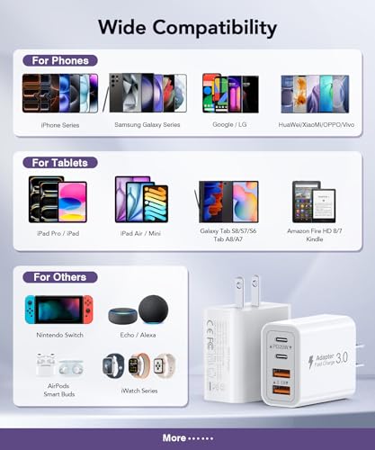 Multiport Charging Plug: The charger brick has Dual USB-C ports and Dual USB-A ports. Allow users to charge phone, tablet and headphones simultaneously to minimize waiting time. It’s also a great space saver instead of taking up 4 wall outlet ports. The best replacement for your original usb charger
