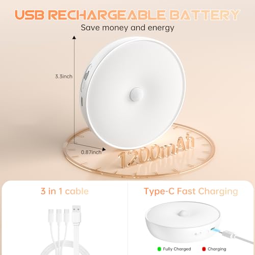 USB Rechargeable Puck Light — The under cabinet lighting closet light is built with a 1200mAh rechargeable battery. It takes 2 hours to fully charge by type-c cable. It can charged by any USB device such as power banks, adapters, etc. LED rechargeable battery-operated puck lights are energy-saving and saving money for your family. Note: Don’t charge for a long time (not more than 12 hours), prohibit use while charging all the time.