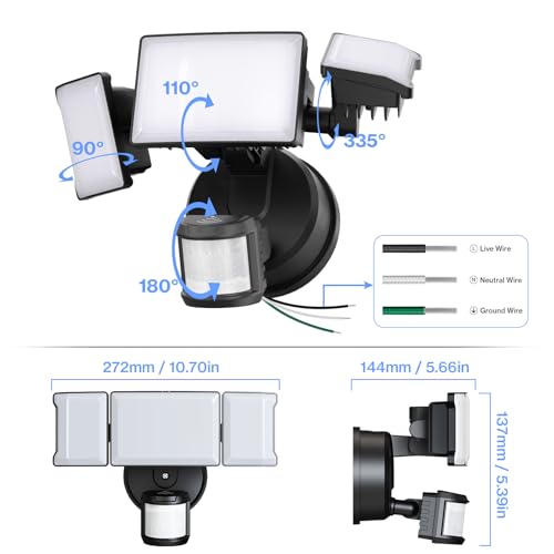 IP65 Waterproof: This IP65 waterproof motion security light, featuring efficient cooling, withstand rain, sleet, and snow for reliable operation in harsh weather. Suitable for yards, porches, garages, hallways, driveways, walkways, and gardens, they offer safety, longevity, and energy efficiency
