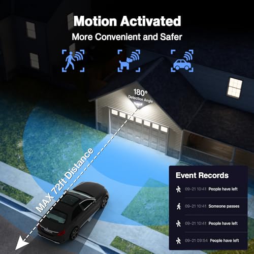 Enhanced Motion Sensor: With a maximum 180° detection angle and a range of up to 72 feet, flood lights outdoor motion sensor offers three adjustable sensitivity levels for quick and sensitive motion detection. App support allows recording of each activation, setting a motion delay timer (6 seconds to 60 minutes), and group linking (multiple lights can be triggered and illuminated simultaneously)