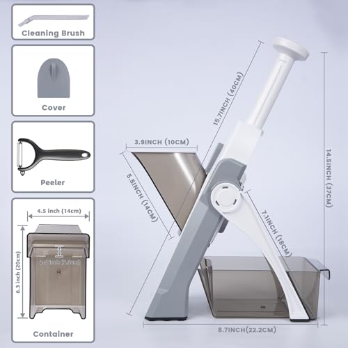 EASY TO USE: First, place the food in the chute, and then simply push the handle to quickly obtain the desired shape – slices, strips, julienne, or dices. The slice thickness can be adjustable from 0.1 to 8mm, great for potatoes, carrots, tomatoes, cucumbers, and more.