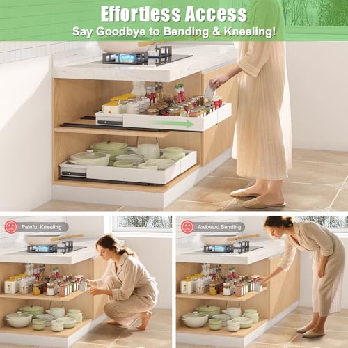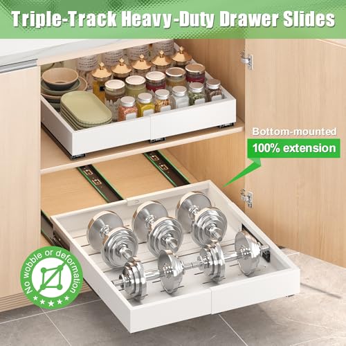 【Heavy-Duty Slide-Out Cabinet Organizers】Triple steel rails support heavy loads (pots/pans/appliances). Cabinet drawers slide out smoothly—even when full. Durable pullout cabinet organizer for pots and pans