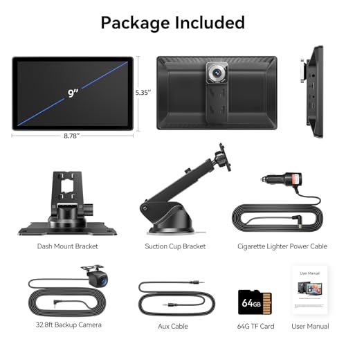 【4K Dash Cam + 1080P Backup Camera】- This Android auto screen support dual recording with 4K front camera (road view) and night vision rear camera (33ft).Our portable carplay screen includes 64GB TF card for continuous loop recording.